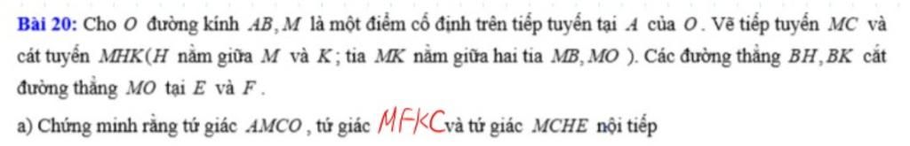 Bài 20: Cho o đường kính AB, M là một điểm cố định trên tiếp tuyến tại A của 0. Vẽ tiếp tuyến MC và