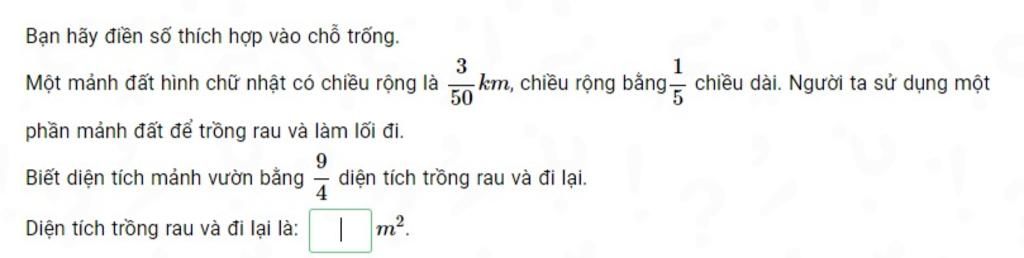 Một mảnh đất hình chữ nhật có chiều rộng là $\frac{3}{50}$ km, chiều rộng bằng $\frac{1}{5}$ chiều dài. Người ta sử dụng một phần mảnh đất để trồng rau và làm lối đi.