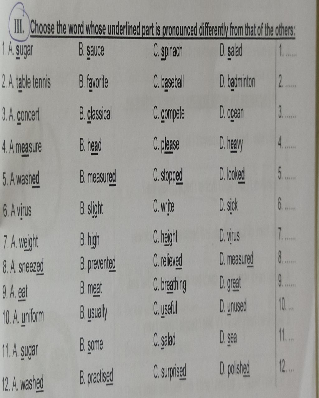 `11. A` (đáp án: /ʃ/, còn lại: /s/)