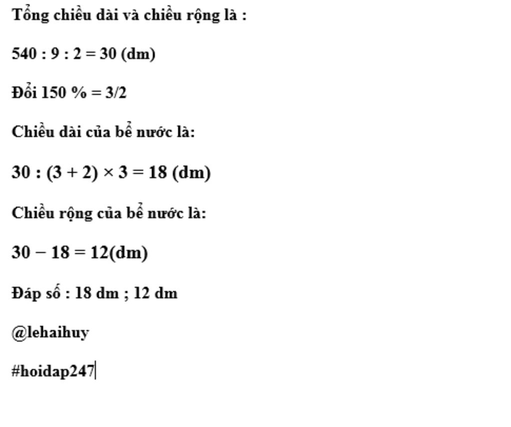 Đáp số: chiều dài: `18 dm` và chiều rộng `12` dm