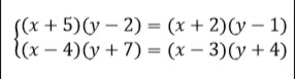 `{((x+5)(y-2)=(x+2)(y-1)),((x-4)(y+7)=(x-3)(y+4)):}`