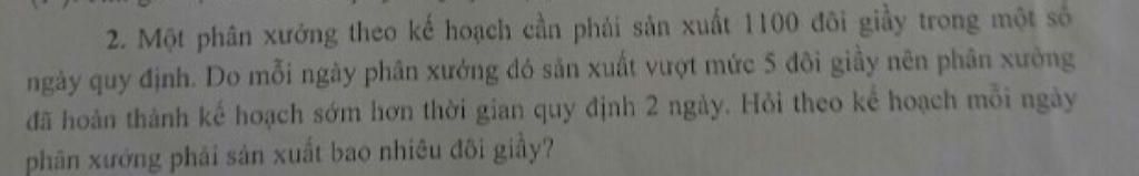 2. Một phân xuởng theo kế hoạch cần phái san xuất 1100 đôi giay trong một số