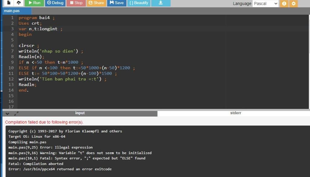 - sửa lại dòng 12 thành: writeln('Tien dien ban phai tra=',t);
