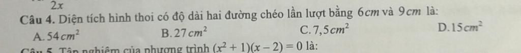 `->` Diện tích hình thoi là : `6 xx 9 : 2 = 27 (cm^2)`