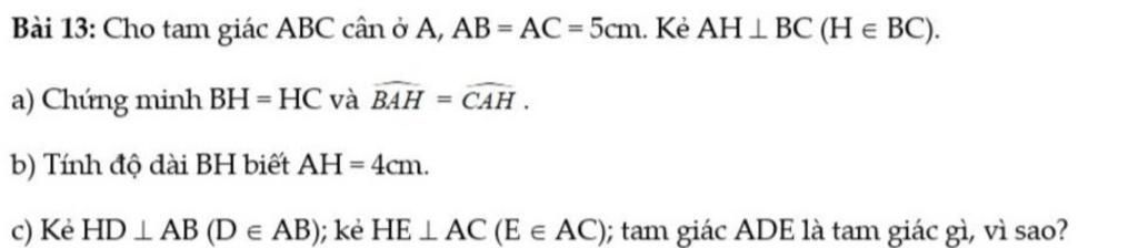 Bài 13: Cho tam giác ABC cân ở A, AB = AC = 5cm. Kẻ AH 1 BC (He BC).