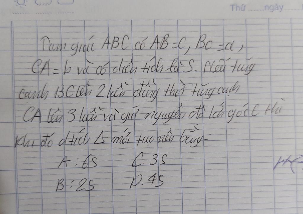 Khi tăng cạnh bc lên 2 lần và cạnh AC lên 3 lần thì diện tích tam giác ABC lúc này là: