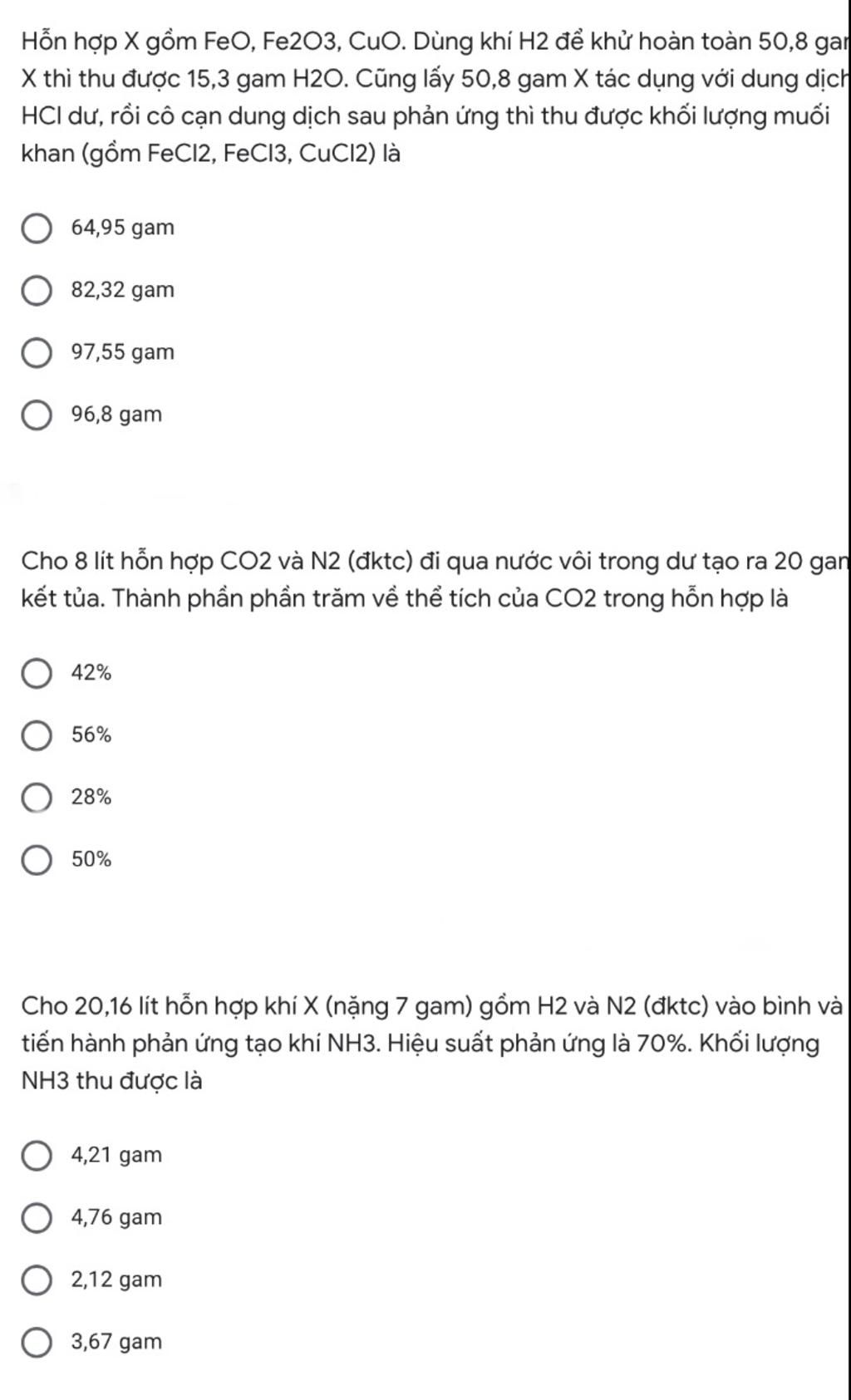 Hỗn hợp X gồm FeO, Fe2O3, CuO. Dùng khí H2 đề khử hoàn toàn 50,8 gar
