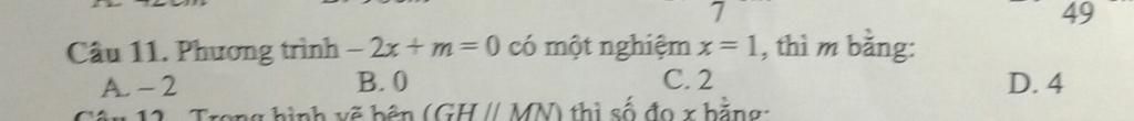 `(-2x) + m = 0` `=>` thay `x = 1` vào phương trình ta được `:`