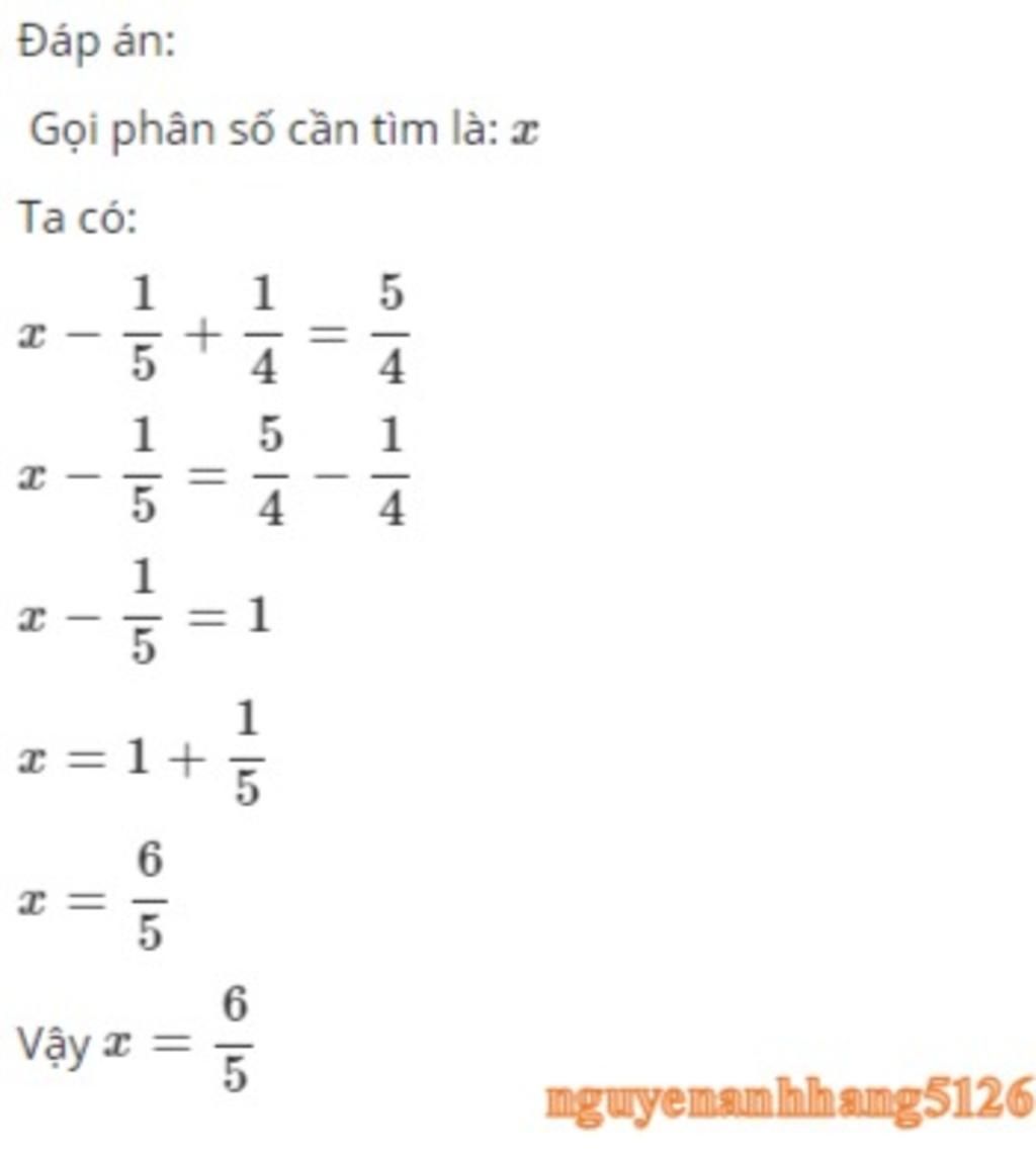 `x-`$\dfrac{1}{5}$`=`$\dfrac{5}{4}$`-`$\dfrac{1}{4}$