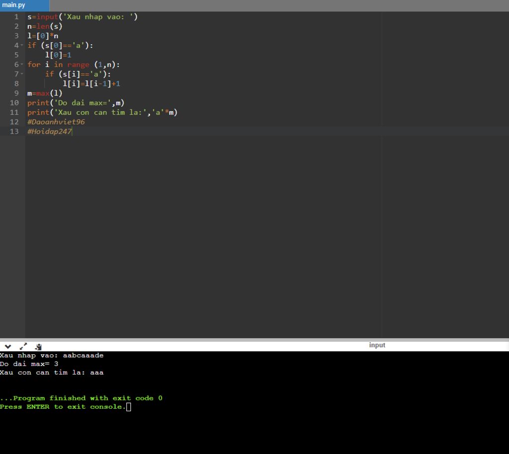 đặt một mảng có 0*n phần tử, nếu là kí tự a thì đặt phần tử vt i thành (i-1)+1, Tìm max dãy, vì cái này là đoạn con a nên in ra max*a là được `=>` Ok thank