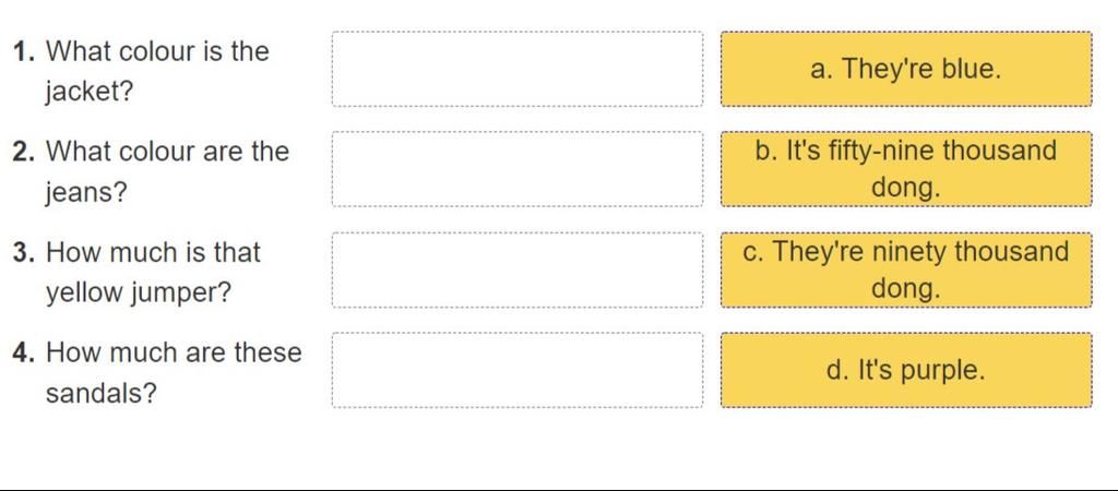 3.How much is that yellow jumper? => b) It's fifty-nine thousand dong.
