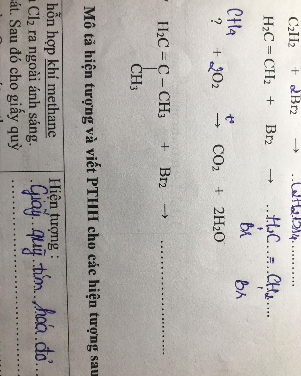 \(C{H_2} = C(C{H_3}) - C{H_3} + B{{\text{r}}_2}\xrightarrow{{}}C{H_2}B{\text{r}} - CB{\text{r}}(C{H_3}) - C{H_3}\)