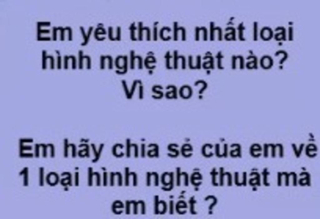 Câu 1. Loại hình nghệ thuật mà em thích là Điêu khắc vì em rất ấn tượng với tác phẩm tượng đá cẩm thạch của Mi-Ken-lăng-giơ sáng tác vào năm 1501 mang tên Đa-vít.