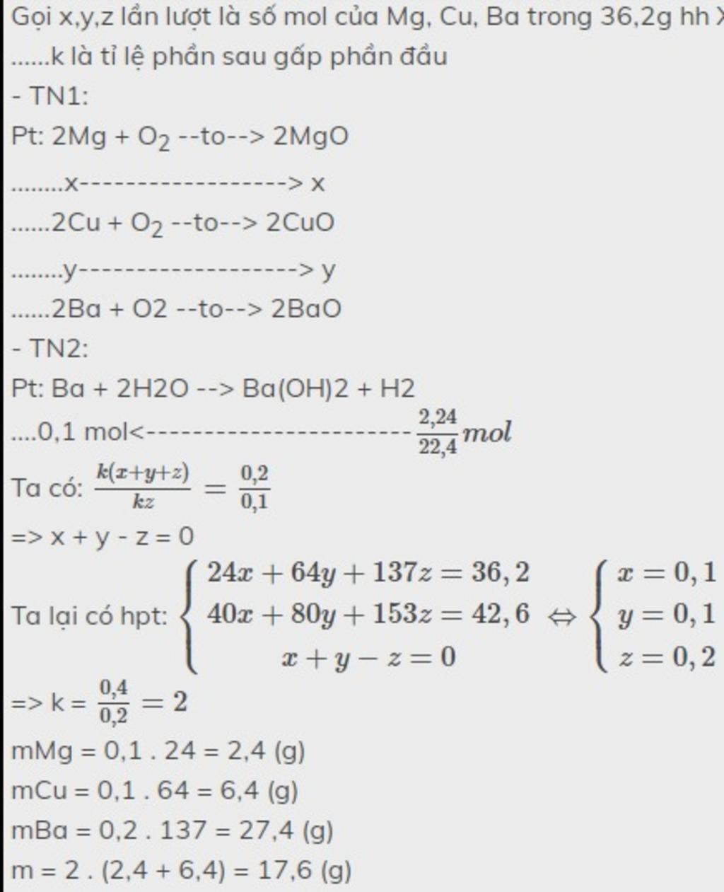 Gọi `x,y,z` lần lượt là số mol của `Mg, Cu, Ba` trong `36,2g` hh `X`