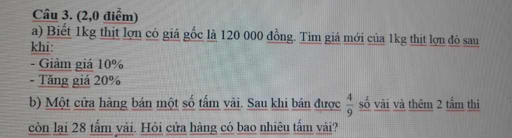 câu 3: a) giảm 10%= 120000 - (120000x10:100%)= 108000 đồng