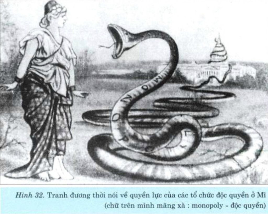 Con rắn khổng lồ, có cái đuôi quấn chặt vào nhà trắng của Mĩ há mồm đe dọa, nuốt sống người dân . Điều này thể hiện vai trò quyền lực của các công ty độc quyền (Mĩ), cấu kết chặt chẽ và chi phối nhà nước tư bản để thống trị và khống chế cuộc sống của nhân dân, được xem là “tự do” ở xã hội các nước đế quốc.