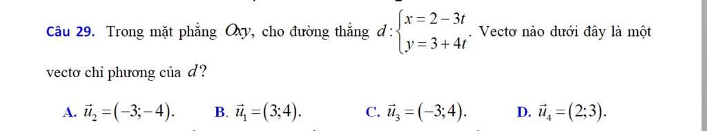 Vậy vectơ chỉ phương là : `\vecu=(-3,4)`