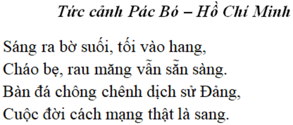 Hồ Chí Minh là vị cha già kính yêu của dân tộc Việt Nam. Sau ba mươi năm bôn ba hoạt động cách mạng ở nước ngoài, Người đã trở về nước để trực tiếp lãnh đạo cuộc cách mạng giải phóng dân tộc. Hoài bão cứu nước đã làm cho Người luôn nghĩ về đất nước: “Đêm mơ ước thấy hình của nước” (Chế Lan Viên). Đất nước Việt Nam luôn in đậm trong trái tim người. Tình yêu đất nước nồng nàn đã làm Bác quên đi sự gian khổ tột cùng trong bước đường hoạt động cứu nước, cứu dân. Bài thớ Tức cảnh Pác Bó đã cho thấy cuộc sống đầy gian khổ của Bác trong thời kì ở hang Pác Bó nhưng cũng thể hiện tâm trạng thoải mái, lạc quan của Người khi được sống giữa thiên nhiên. Tuy thiếu thốn về vật chất nhưng Bác vẫn tràn đầy tình yêu thiên nhiên và lòng lạc quan tin tưởng. Bác tự hào về cuộc sống đầy ý nghĩa của người cách mạng