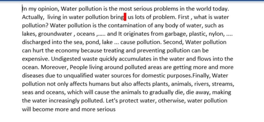 the more society develops, the more advanced machines make factories appear in many places, but from these benefits, there are still harmful effects it causes, which is the problem of "pollution water source". currently, millions of waste are discharged into rivers, lakes and seas, causing polluted water sources, causing unsanitary environment along with the stench from the water that makes the urban landscape become worsen. what is the main cause of water pollution? the first cause is also human due to the lack of awareness of each person, who has dumped waste into rivers, lakes and seas causing heavy pollution and partly because factories and factories have discharged waste water. tons of waste and sewage make the pollution extremely serious, along with it, it has affected the lives of people in areas with pollution water, causing skin and lung diseases...that's why from now on let's join hands to raise awareness about environment protection as soon as we can.