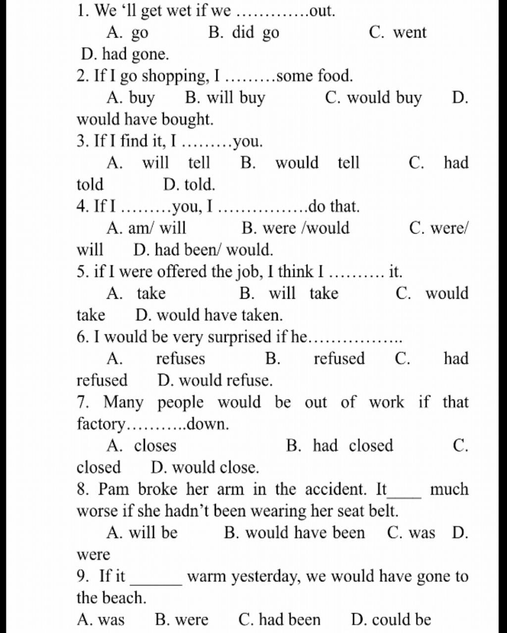 Câu điều kiện loại 1: If+S+V(s/es), S+will/can...+Vbare câu điều kiện loại 2 If+S+were/(V2/ed), S+would/could..+V1
