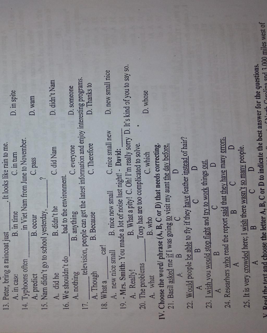 13. a ( in case: đề phòng. Dịch: Peter, mang áo mưa đến đây để đề phòng. Trời trông có vẻ mưa đấy)