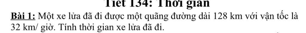 $⇒t= \dfrac{s}{v}= \dfrac{128}{32}= 4 (giờ)$