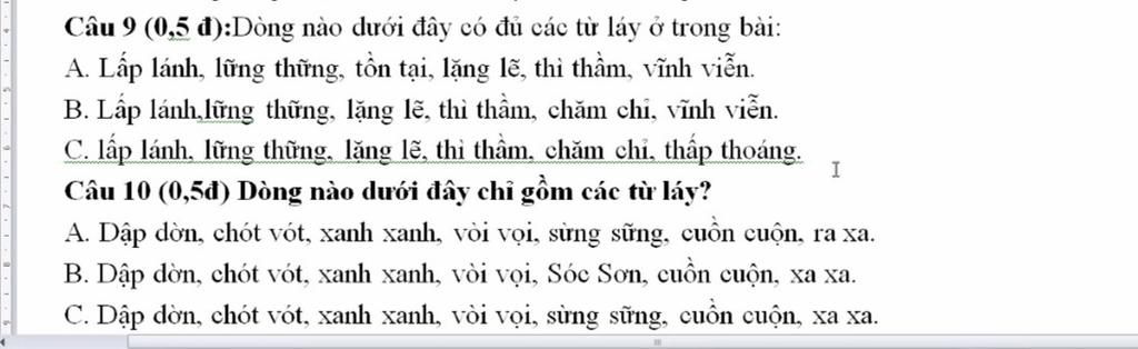 Câu `9:` Dòng có đủ các từ láy ở trong bài là: