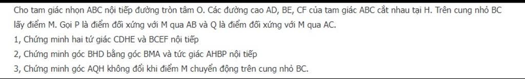 $\to \widehat{AQH}=\widehat{ACH}=\widehat{ACF}=90^o-\widehat{FAC}=90^o-\widehat{BAC}$ không đổi khi $M$ di chuyển trên cung $BC$