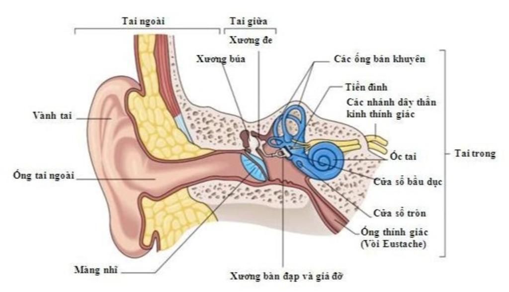+ Tai giữa gồm : xương búa ( gắn vào màng nhĩ ) , xương đe và xương bàn đạp ( áp vào 1 màng giới hạn của tai trong ) , tai giữa thông với nhau nhờ có vòi nhĩ bảo đảm qpas suất hai bên màng nhĩ được cân bằng .