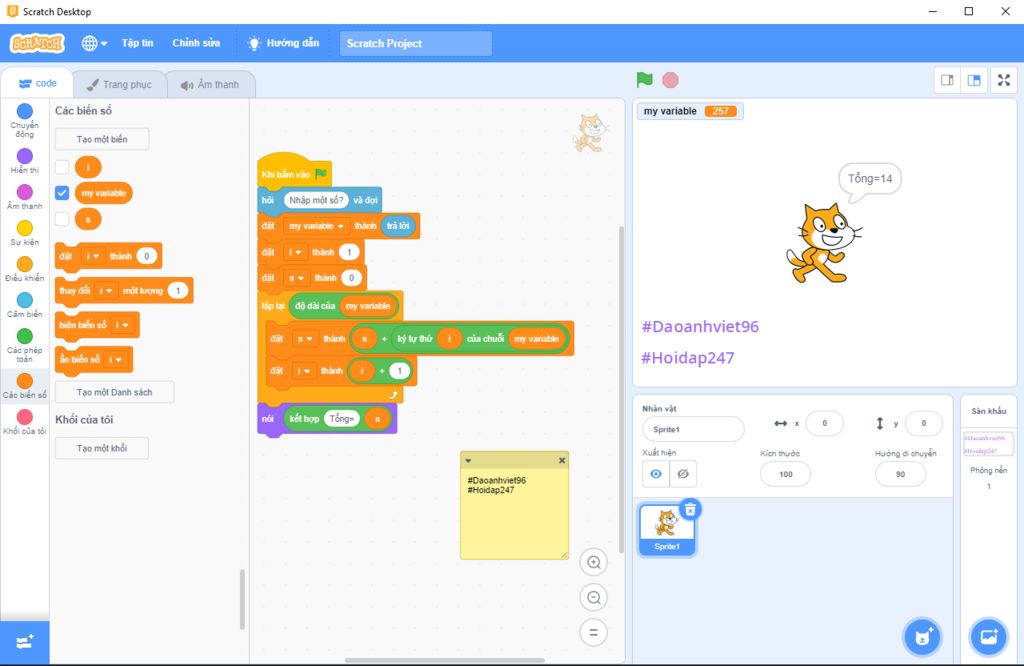 Vì trong scratch, chuỗi bắt đầu =1. i+1 vì mình sẽ tính tổng các số của n, i là biến đếm để gọi các chữ số của n. Nếu mà đặt i trước tổng thì i=1+1=2 nên tổng không thể cộng được số hạng đầu tiên.