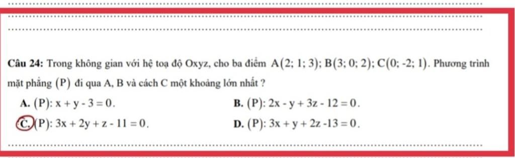 Câu 24: Trong không gian với hệ toạ độ Oxyz, cho ba điểm A(2; 1; 3); B(3; 0; 2); C(0; -2; 1). Phương trình