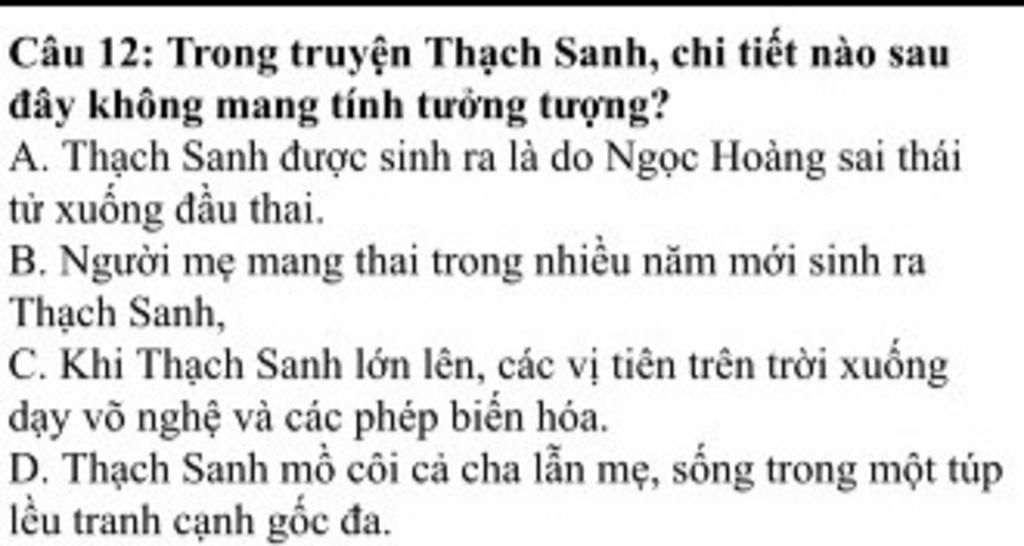 $D.$ Thạch Sanh mồ côi cả cha lẫn mẹ, sống trong một túp lều tranh cạnh gốc đa