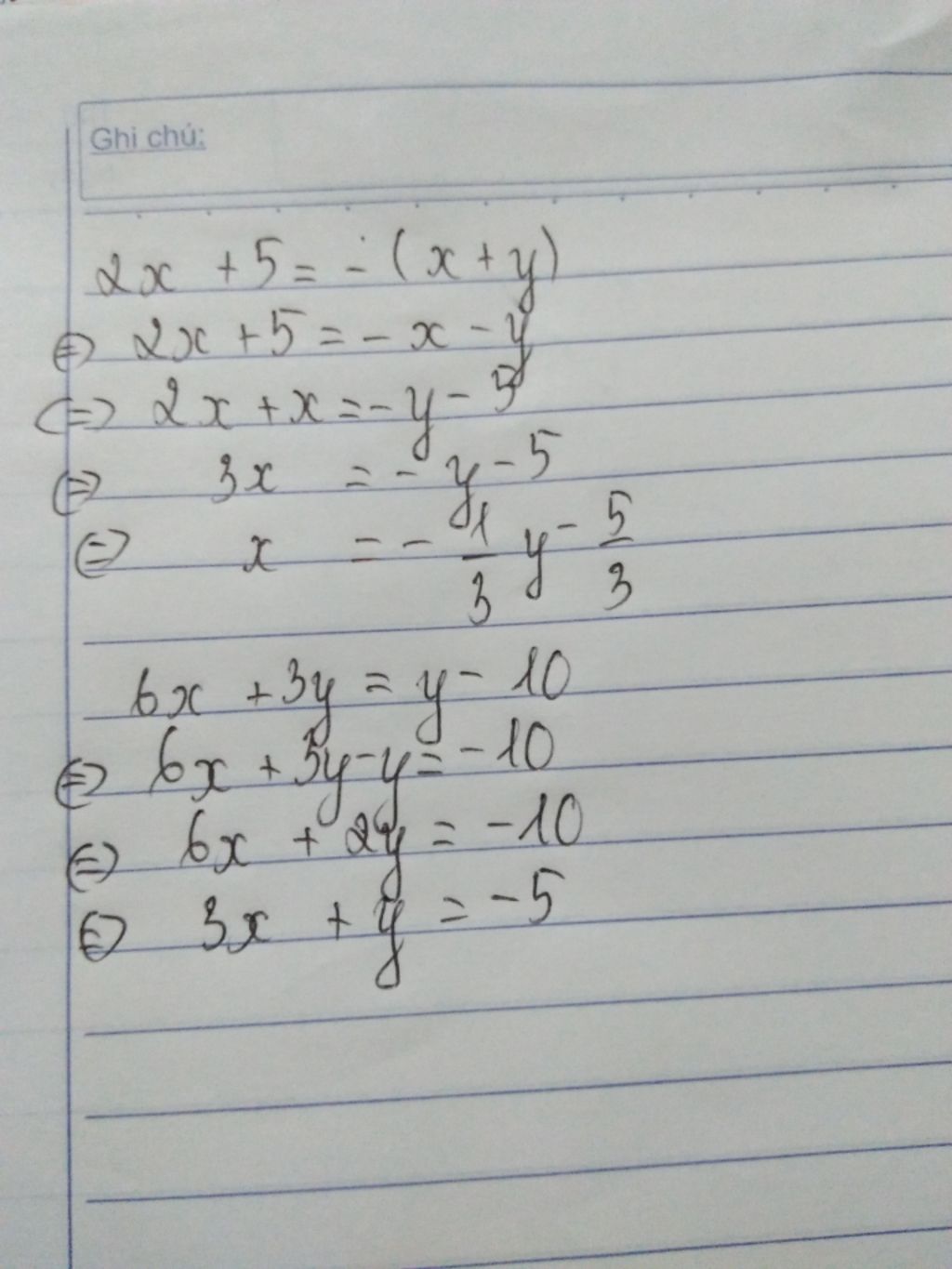 $6x+2y=-10⇔6x+2.(-3x-5)=-10⇔0x=0$ (Đúng $∀x$)