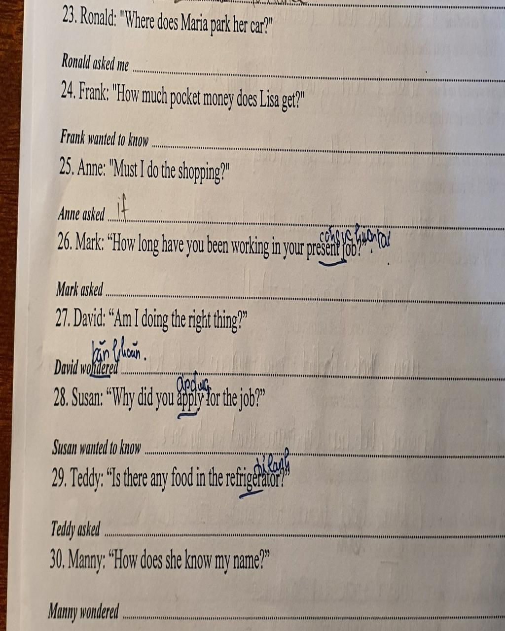24. Ronald asked me where Maria parked her car ( lùi thì HTĐ->QKĐ )