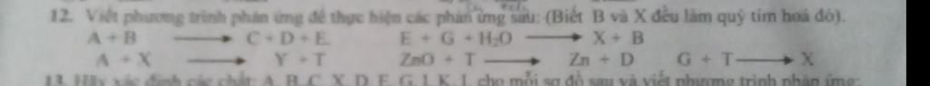 $X:\ HCl\\ A:\ Fe\\ B:\ H_2SO_4\\ C:\ Fe_2(SO_4)_3\\ D:\ H_2O\\ E:\ SO_2\\ X:\ HCl\\ G:\ Cl_2\\ T:\ H_2\\ Y:\ FeCl_2\\ PTHH:\\ 2Fe+6H_2SO_4\to Fe_2(SO_4)_3+6H_2O+3SO_2\\ SO_2+Cl_2+H_2O\to HCl+H_2SO_4\\ Fe+2HCl\to FeCl_2+H_2\\ ZnO+H_2\xrightarrow{t^0} Zn+H_2O\\ H_2+Cl_2\xrightarrow{t^0} 2HCl$