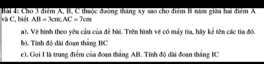 Bài 4: Cho 3 điểm A, B, C thuộc đường thăng xy sao cho điểm B năm giữa hai điểm A