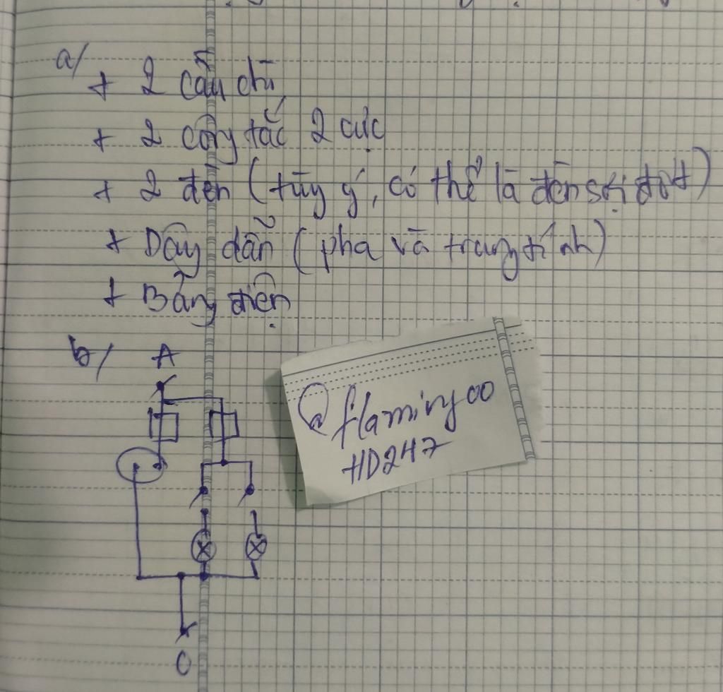 a, Cho 2 cầu chì, 2 công tắc 2 cực, 2 bóng đèn. Em hãy vẽ sơ đồ lắp đặt mạch điện điều khiển 2 bóng đèn sáng độc lập nhau? Chi rõ các phần tử có trong mạch điện?