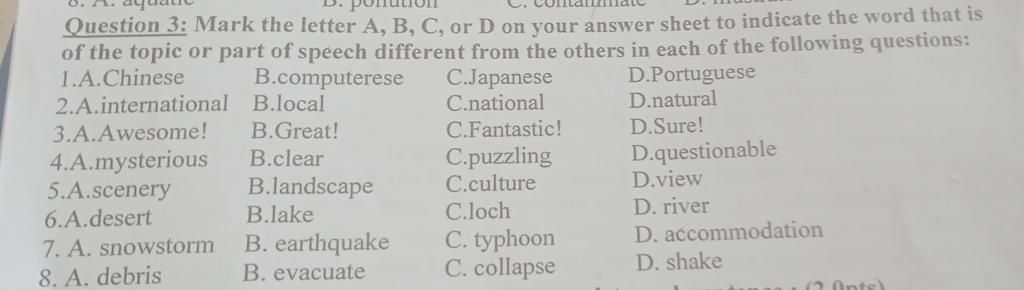 Question 3: Mark the letter A, B, C. or D on vour answer sheet to indicate the word that is