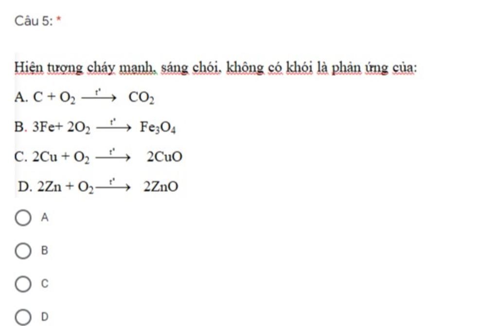 Hiện tượng cháy mạnh, sáng chới, không có khói là :