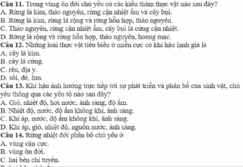 ->Giải thích: Trong vùng ôn đới chủ yếu có các kiểu thảm thực vật là rừng lá kim, rừng lá rộng và rừng hỗn hợp, thảo nguyên.