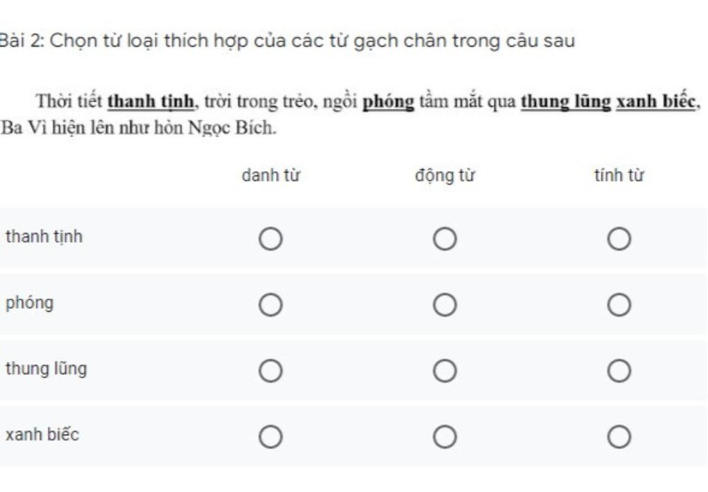 ⇒Tính từ là từ dùng để chỉ tính chất, tính cách, màu sắc, trạng thái, mức độ, phạm vi… của người hoặc vật