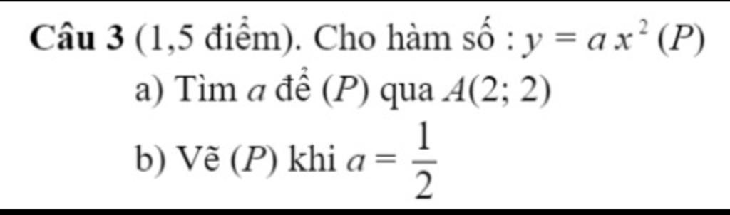 Vậy, `a=1/2` thì hàm số `y=ax^2(P)` đi qua `A(2; 2)`