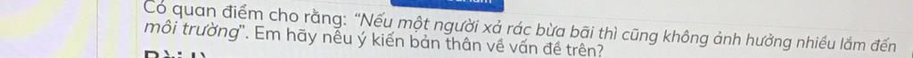 -> Hành động đó không làm xấu môi trường nhưng cũng tạo ra một thói quen xấu. Càng về sau thì họ càng xả rác bừa bãi, làm cho ô nhiễm môi trường. Vậy nên chúng ta cần bao vệ môi trường, chúng ta không nên xả rác cho dù là một hành động nhỏ.