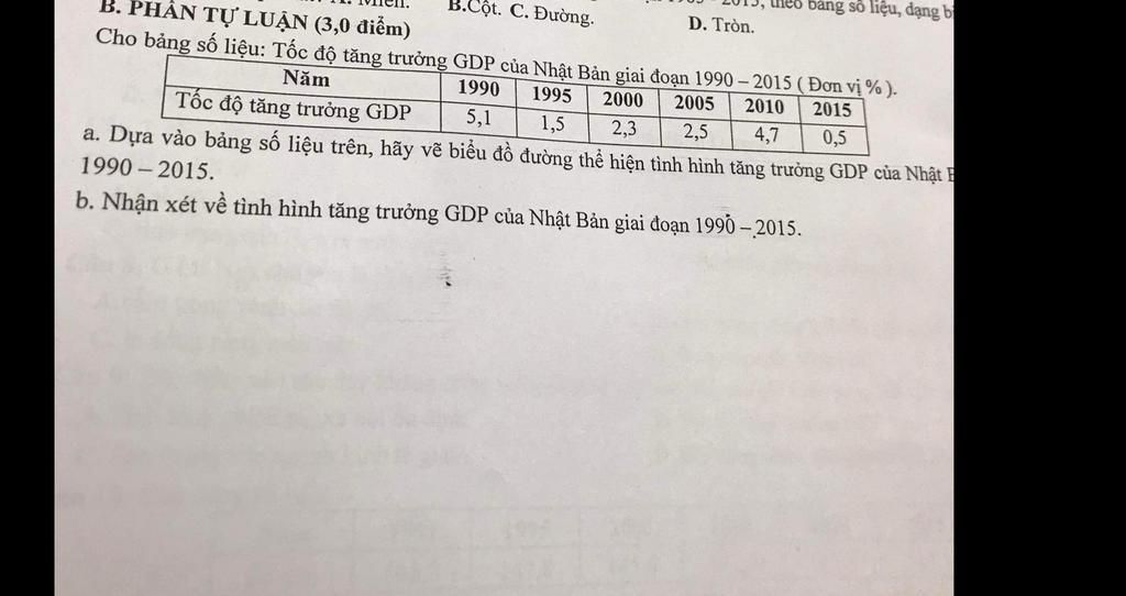 Cho bảng số liệu: Tốc độ tăng trưởng GDP của Nhật Bản giai đoạn 1990 – 2015 (Đơn vị%).