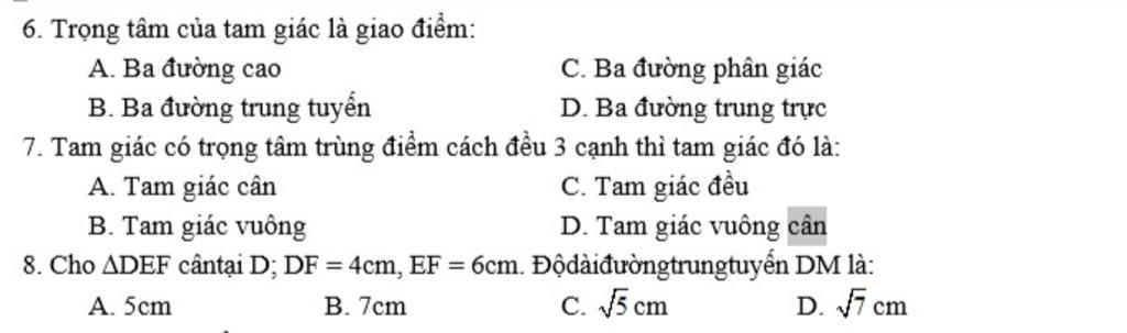 7. Tam giác có trọng tâm trùng điểm cách đều 3 cạnh thì tam giác đó là:
