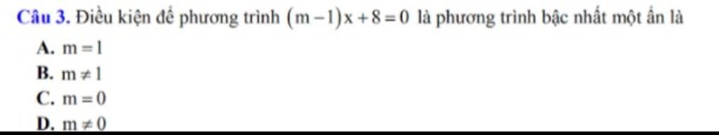 Để ( m - 1 )x + 8 = 0 ⇒ m - 1 khác 0 ⇒ m khác 1