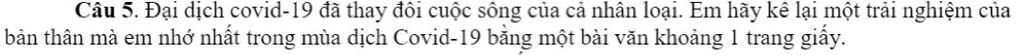 Câu 5. Đại dịch covid-19 đã thay đổi cuộc sông của cả nhân loại. Em hãy kê lại một trải nghiệm của