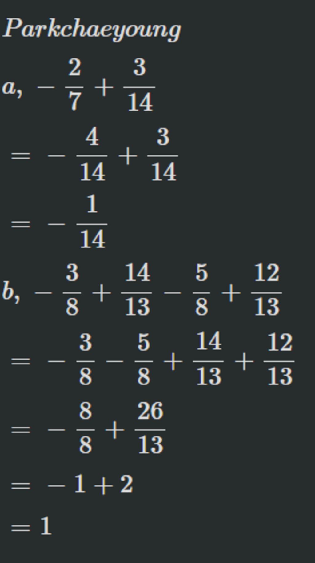 a) -2/7 + 3/14 b) -3/8 + 14/13 - 5/8 + 12/13