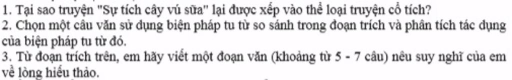 Cậu oà lên khóc. Mẹ đã không còn nữa. Cậu nhìn lên tán lá, lá một mặt xanh bóng, mặt kia đỏ hoe như mắt mẹ khóc chờ con. Cậu ôm lấy thân cây mà khóc, thân cây xù xì, thô ráp như đôi bàn tay làm lụng của mẹ. Nước mắt cậu rơi xuống gốc cây, Cây xòa cành ôm cậu, rung rinh cành lá như tay mẹ âu yếm vỗ về.Cậu kể cho mọi người nghe chuyện về người mẹ và nỗi ân hận của mình...Trái cây thơm ngon ở vườn nhà cậu, ai cũng thích... Họ đem về gieo trồng khắp nơi và đặt tên là Cây Vú Sữa.