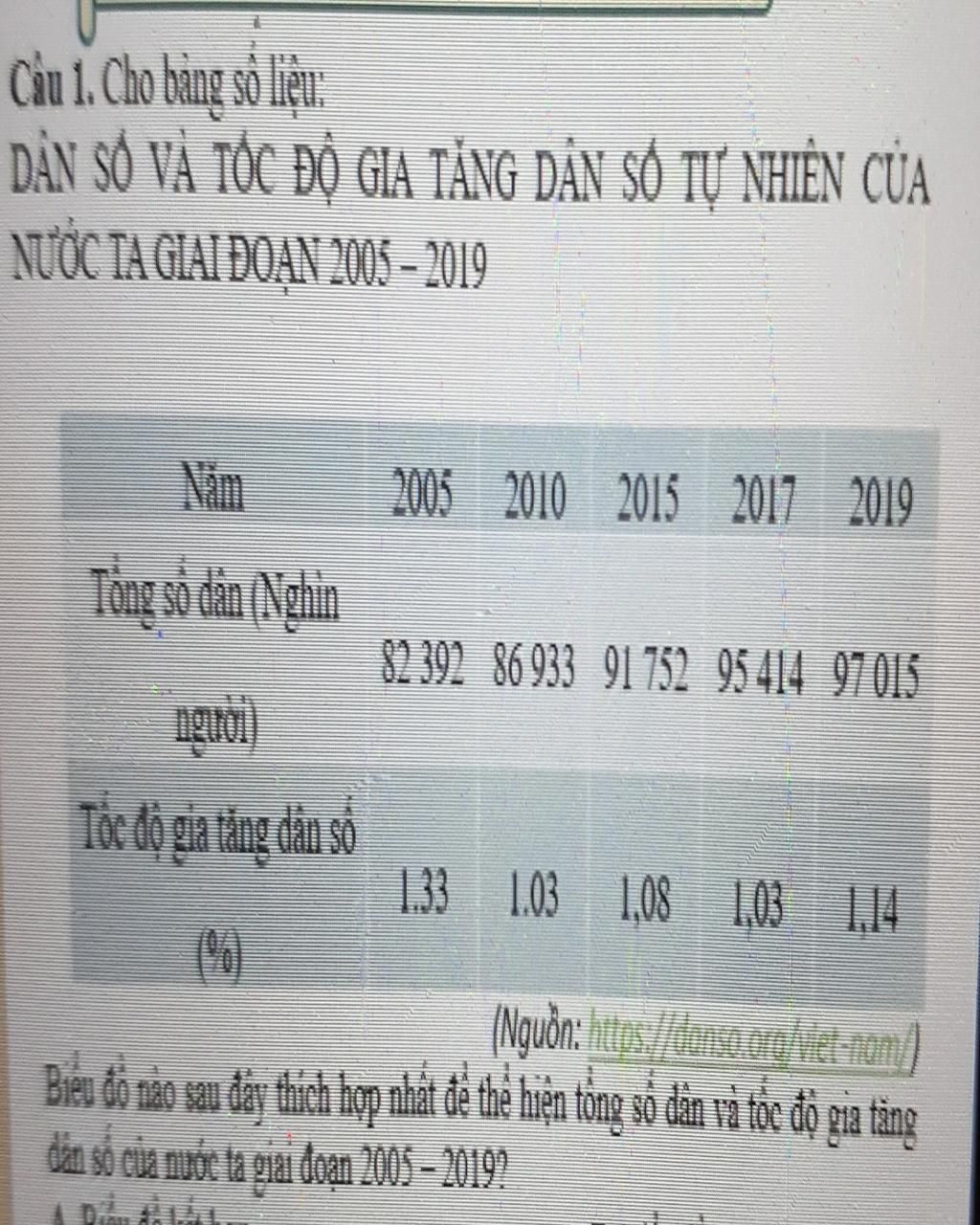 Từ bảng số liệu cho thấy biểu đồ thích hợp nhất để thể hiện tổng số dân và tốc độ gia tăng dân số của nước ta giai đoạn 2005 - 2019 là: biểu đồ cột kép